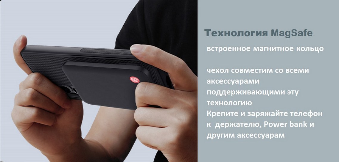 Magnetic в названии модели - чехол поддерживает MAGSAFE. В материал чехла встроено магнитное кольцо, за счет этого телефон можно крепить, например, к автомобильному держателю с беспроводной зарядкой или примагнитить аксессуар-кейс для визиток.