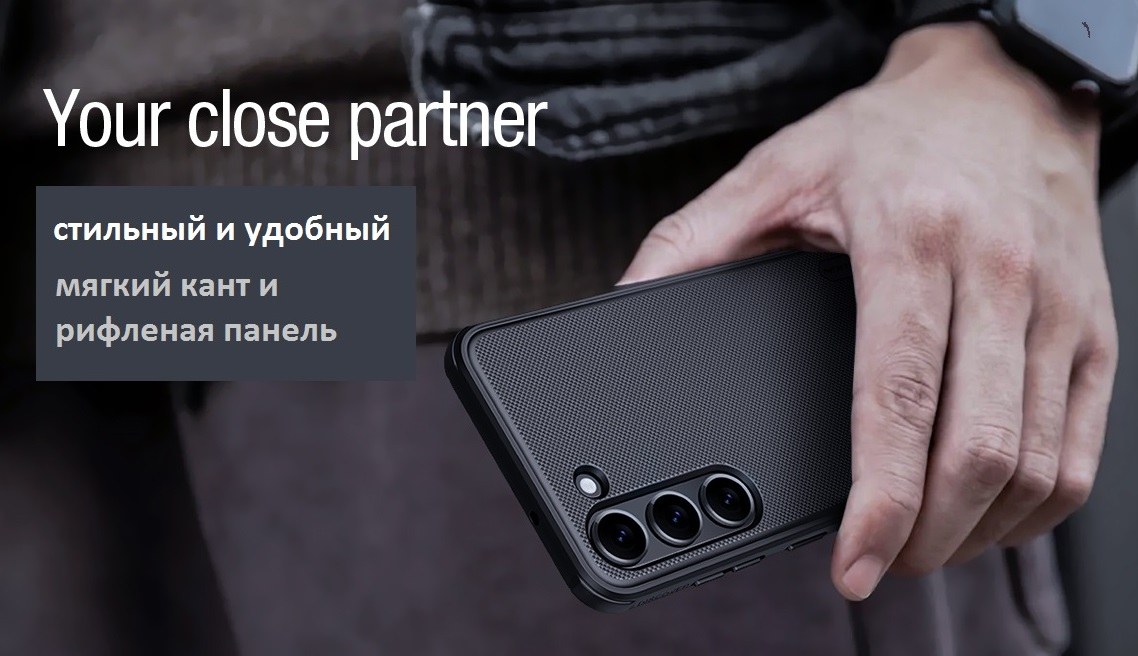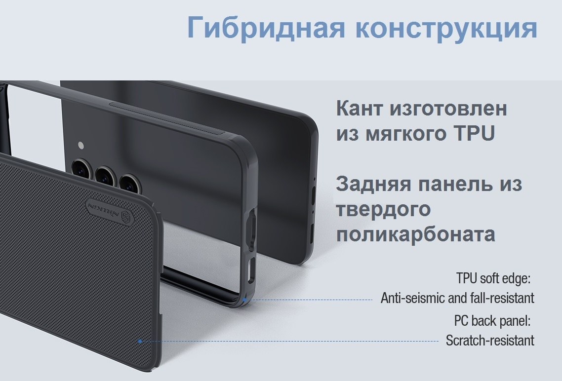 Чехол имеет комбинированную конструкцию, изготовлен из двух видов материала. Контур выполнен из мягкого TPU материала (термопластичный полиуретан), задняя панель изготовлена из более твердого поликарбоната и имеет рельефную поверхность. На такой поверхности не видны следы отпечатков и чехол удобнее держать в руке.