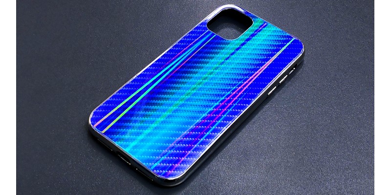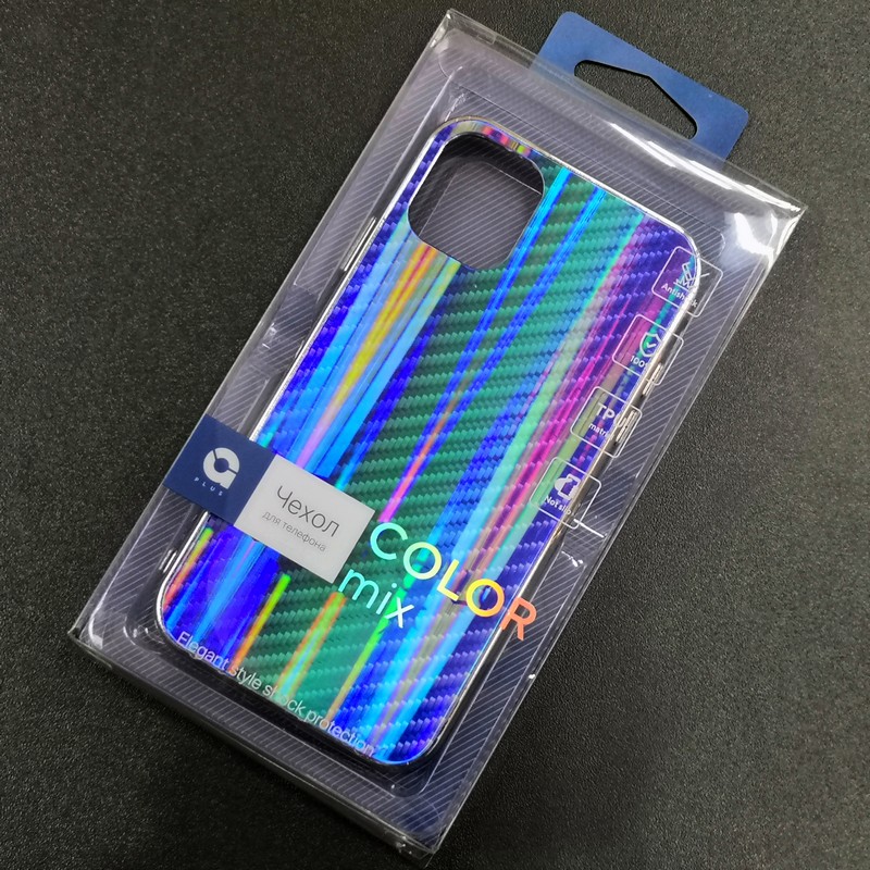 Задняя часть чехла-бампера имеет стильный и интересный вид под стиль карбона, радует глаз игрой цвета, так как переливается многими цветами под разными углами.
