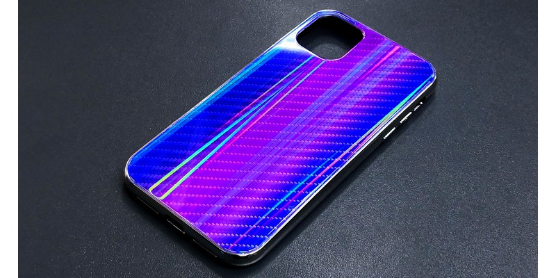 Задняя часть чехла-бампера имеет стильный и интересный вид под стиль карбона, радует глаз игрой цвета, так как переливается многими цветами под разными углами.