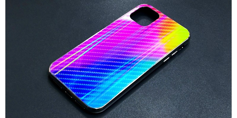 Задняя часть чехла-бампера имеет стильный и интересный вид под стиль карбона, радует глаз игрой цвета, так как переливается многими цветами под разными углами.