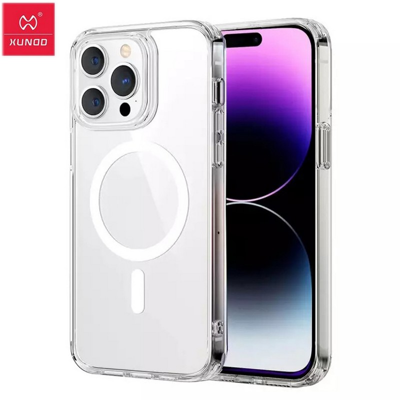 Чехол премиум класса от бренда Xundd для Айфон 14 Про Макс, с поддержкой MagSafe, пластиковый с силиконовыми гранями прозрачный.