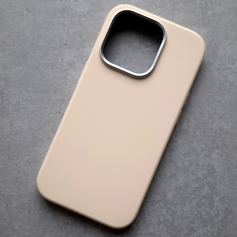 Чехол премиум класса для Айфон 14 про, с поддержкой MagSafe и металлической защитой блока камер Silicone Case BuckSuiti, бежевый.