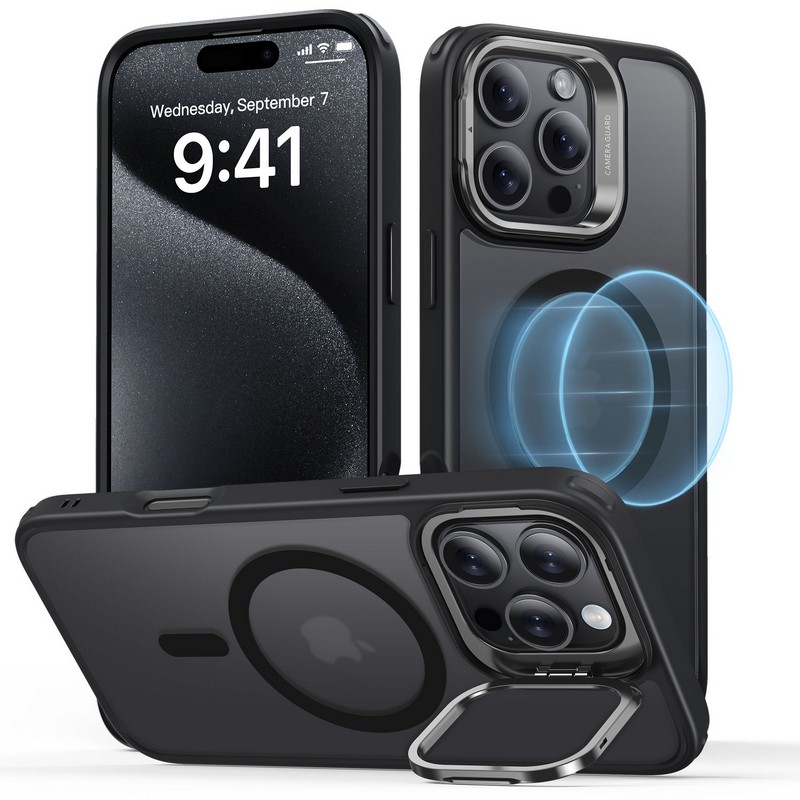 Чехол с откидной подставкой от бренда ESR с поддержкой MagSafe для телефона iPhone 16 Pro Max, Classic Hybrid Case with Stash Stand Frosted Black (матовый с черным)