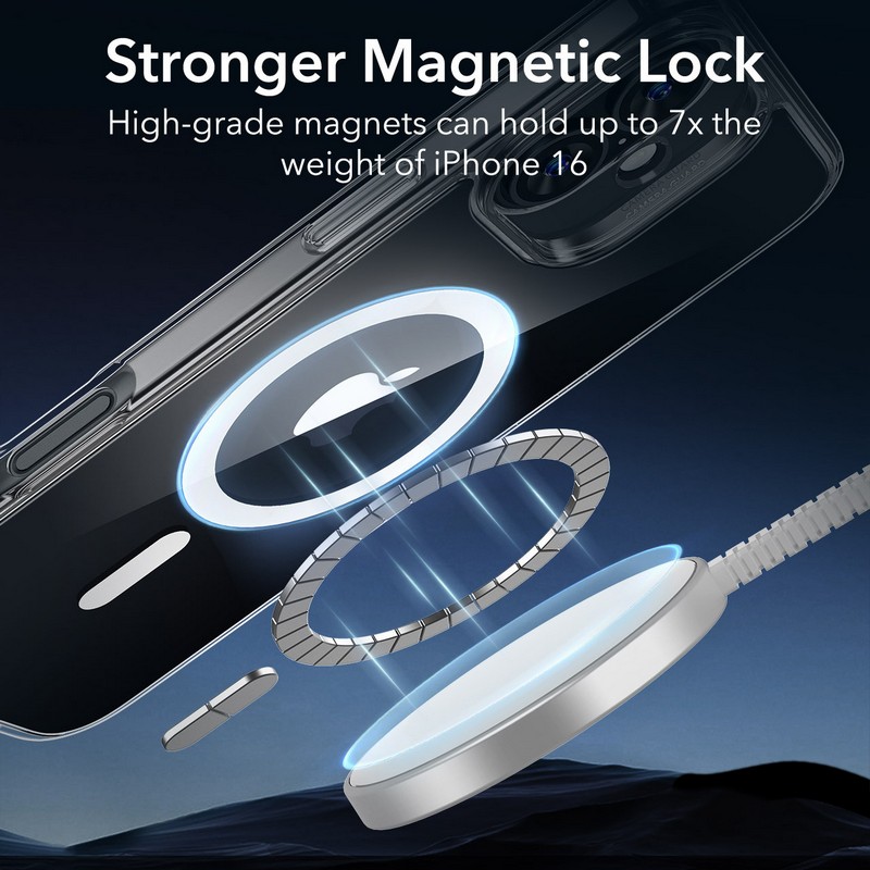 Мощные встроенные магниты с удерживающей силой 1 500 g обеспечивают более прочную магнитную блокировку зарядных устройств и аксессуаров типа MagSafe, чем ваш телефон без чехла или даже официальные чехлы MagSafe.