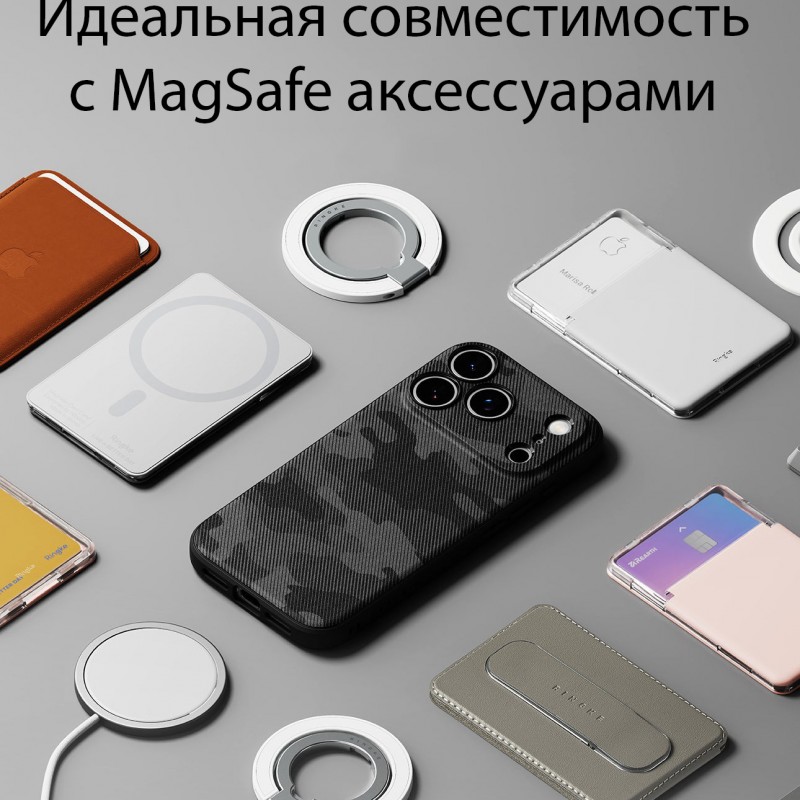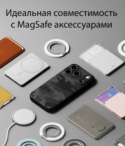 Корпус имеет встроенное магнитное кольцо, совместимое с беспроводной технологией MagSafe. Наслаждайтесь широким спектром аксессуаров с MagSafe, не снимая чехол с телефона.