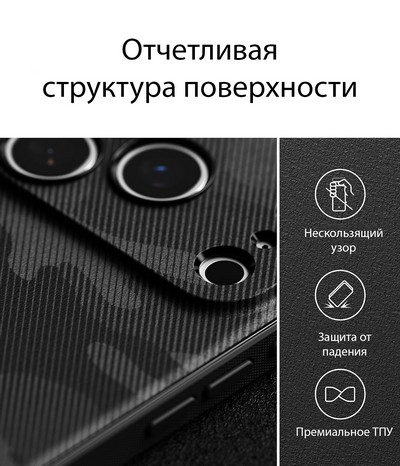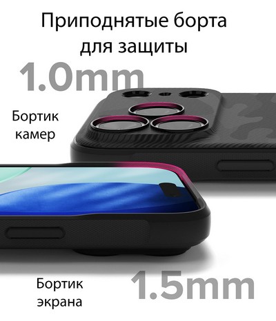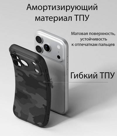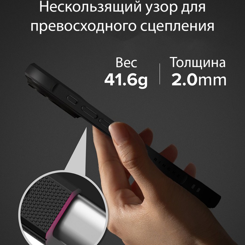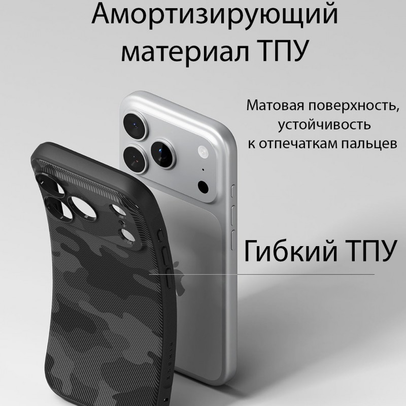 Стильный чехол от Ringke. Корпус изготовлен из прочного мягкого термопластичного полиуретана. Он плотно прилегает, а нескользящая поверхность и шероховатые стороны гарантируют, что устройство надежно лежит в руке. Инновационные углы защищают устройство от повреждений.