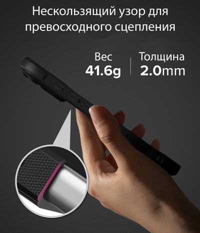 Специальная матовая гранулированная поверхность не скользит и защищает от отпечатков пальцев. Корпус защищает ваш телефон во время падений, благодаря соответствию стандартам сопротивления Military Grade. Слегка выступающие края защищают экран и камеру от царапин на плоской поверхности.