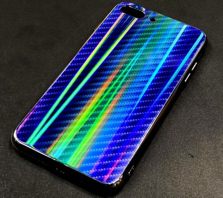 Задняя часть чехла-бампера имеет стильный и интересный вид под стиль карбона, радует глаз игрой цвета, так как переливается многими цветами под разными углами.