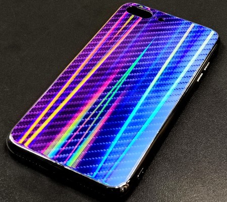 Задняя часть чехла-бампера имеет стильный и интересный вид под стиль карбона, радует глаз игрой цвета, так как переливается многими цветами под разными углами.