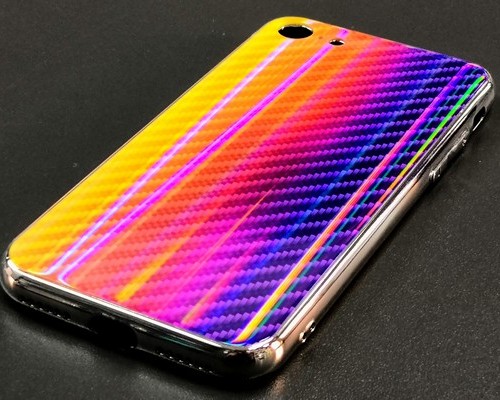 Задняя часть чехла-бампера имеет стильный и интересный вид под стиль карбона, радует глаз игрой цвета, так как переливается многими цветами под разными углами.