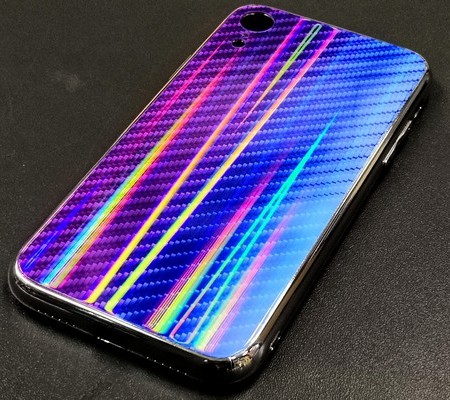 Задняя часть чехла-бампера имеет стильный и интересный вид под стиль карбона, радует глаз игрой цвета, так как переливается многими цветами под разными углами.