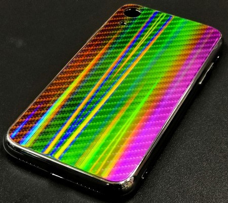 Задняя часть чехла-бампера имеет стильный и интересный вид под стиль карбона, радует глаз игрой цвета, так как переливается многими цветами под разными углами.