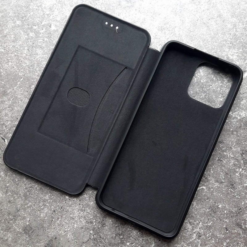 В чехле-книжке есть встроенный слот под банковскую карту, проездной или визитку.