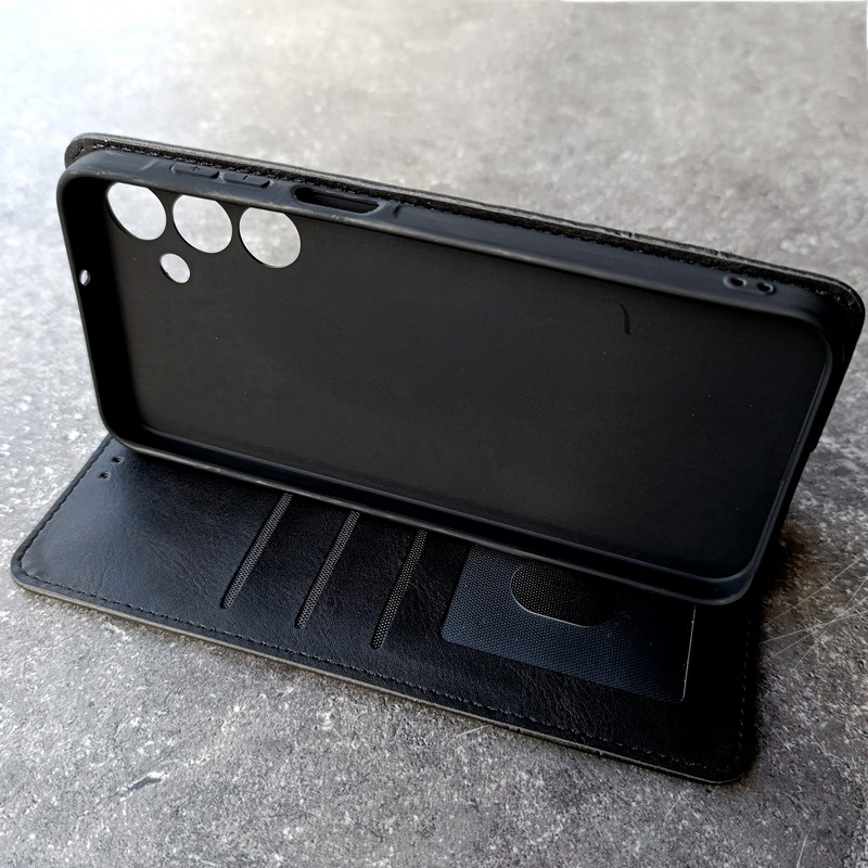 В чехле-книжке есть встроенный слоты под банковские карты, проездной или визитку.