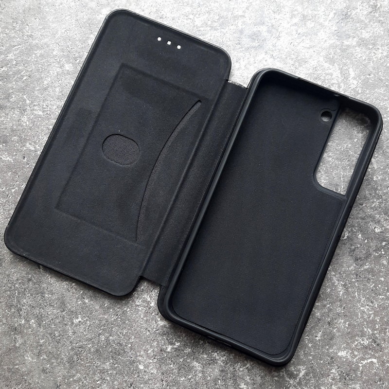 В чехле-книжке есть встроенный слот под банковскую карту, проездной или визитку.