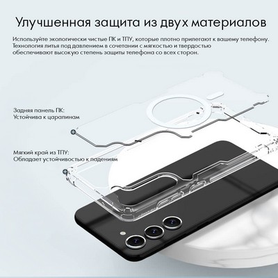 - Материал - задняя часть из поликарбоната (PC), устойчивость к царапинам, в комбинации с мягким TPU (термополиуритан) - защита от падений.