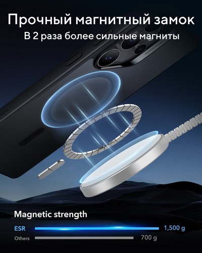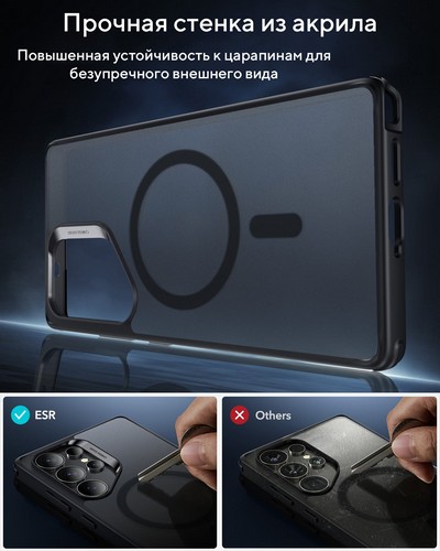 Компания ESR производит стильные и качественные аксессуары и данный чехол не исключение. Особенность чехла - комбинированная конструкция. Боковины чехла изготовлены их мягкого термопластичного полиуретана, задняя стенка из твердого акрила. Чехол также оснащен встроенным магнитным кольцом для беспроводной зарядки или использования с другими аксессуарами Magsafe, например держатели, кошельки и др.