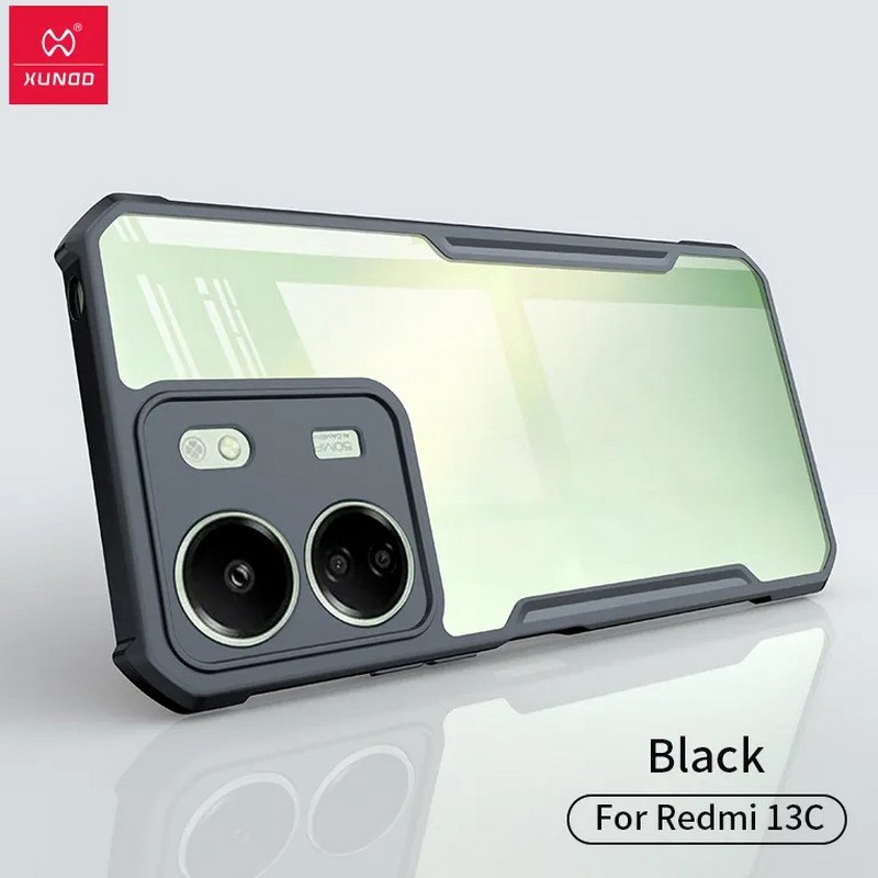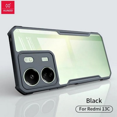 Комбинированный чехол (PC + TPU) для телефона Xiaomi Redmi 13C, прозрачный с черными гранями. Бренд XUNDD.