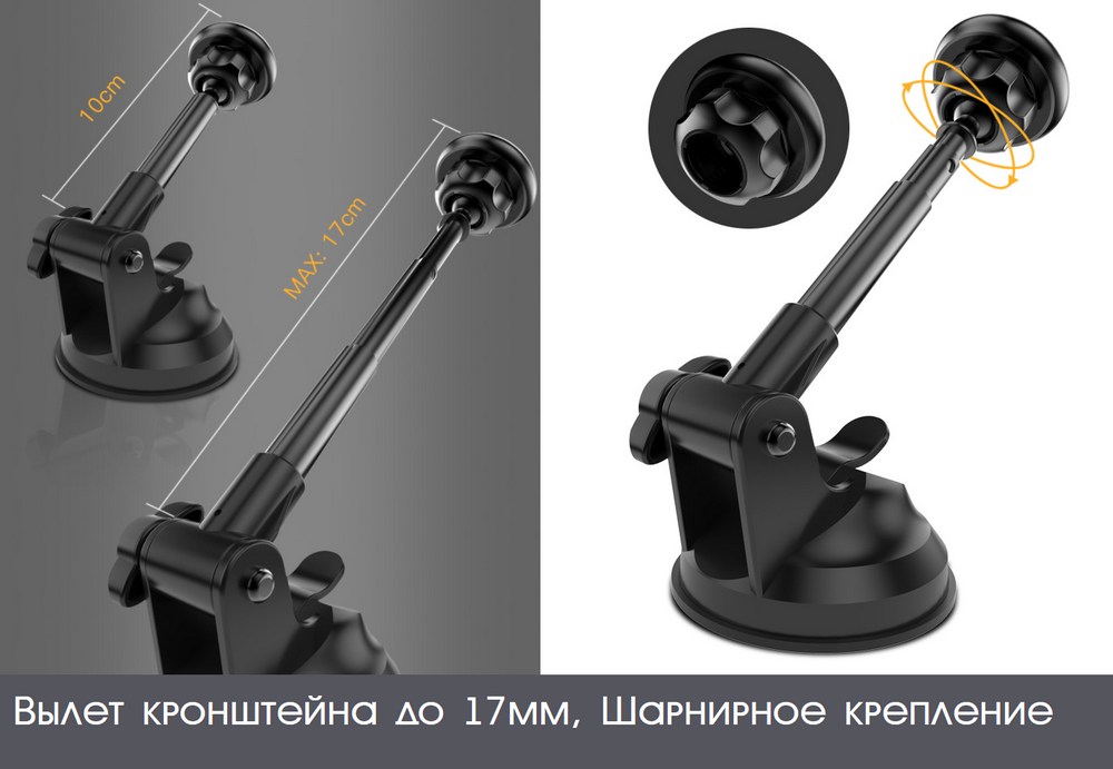 Кронштейн держателя имеет вылет до 17 см, телефон можно придвинуть ближе или отодвинуть на удобную дистанцию. С помощью шарнира в основании магнитной части, смартфон можно дополнительно вращать на 360 градусов.
