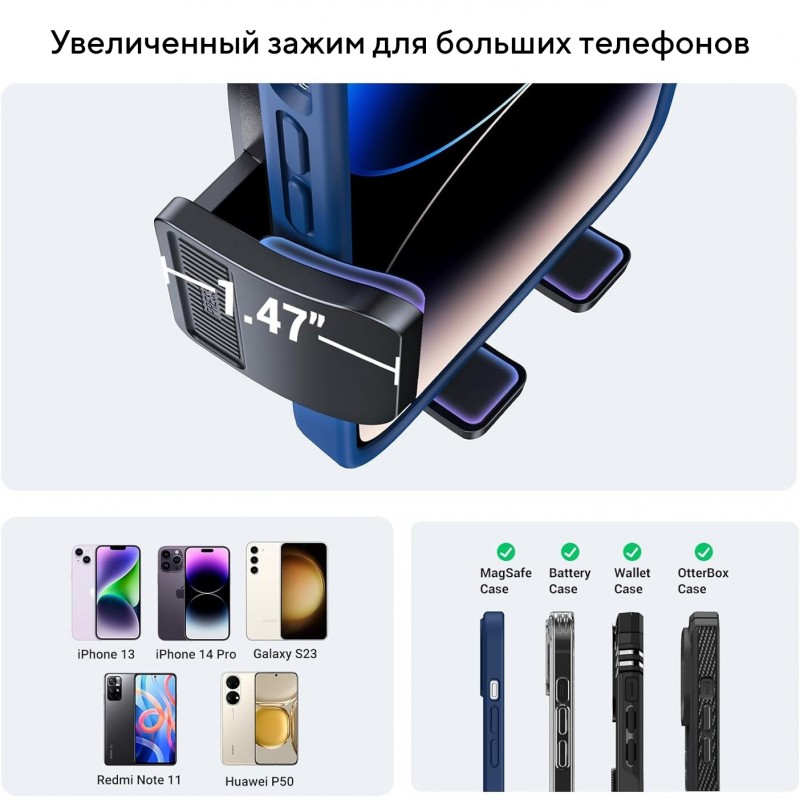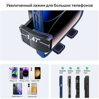 Улучшенный сверхширокий зажим шириной 1,47 дюйма надежно удерживает большие телефоны с чехлами толщиной до 0,84 дюйма, включая MagSafe.