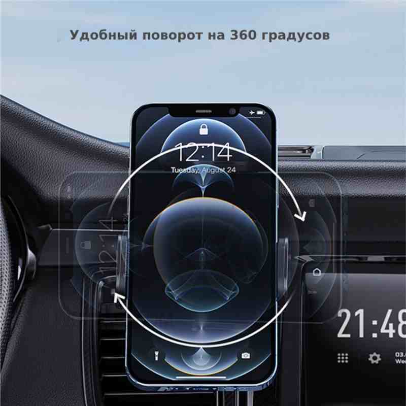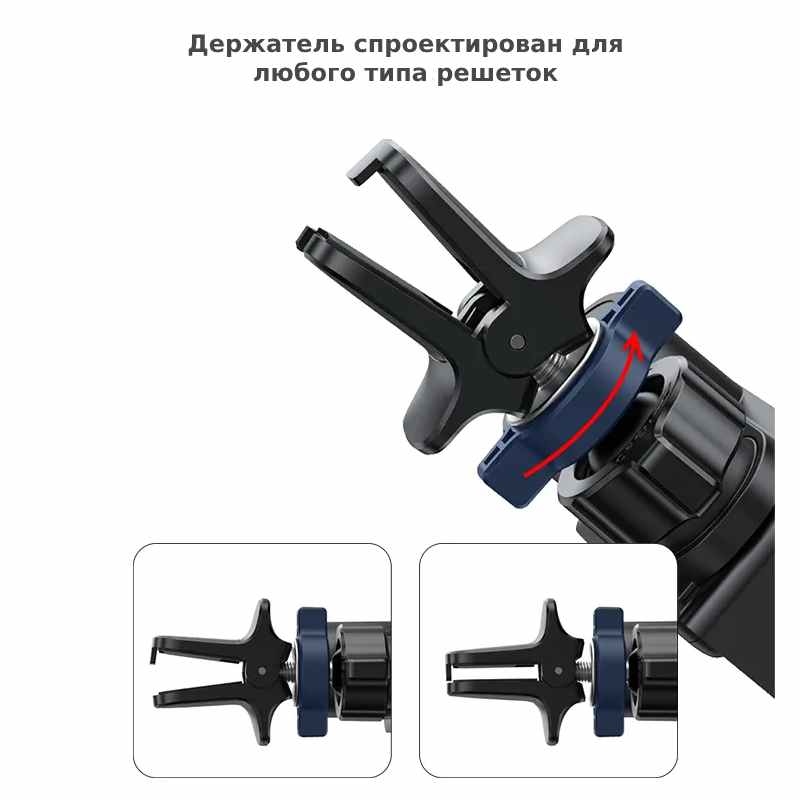 Держатель надёжно крепится в вентиляционную решетку автомобиля с помощью винтового зажима. Шарнир в держателе с вращением на 360 градусов позволяет отрегулировать свой телефон на любой угол.