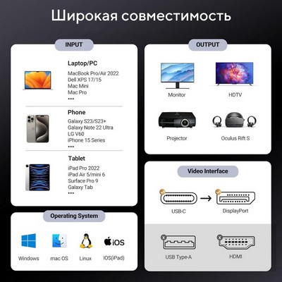 Многорежимный просмотр позволяет использовать несколько мониторов, а усовершенствованный материал, включая нейлоновую оплетку и алюминиевый корпус, обеспечивает долговечность и безопасность. Совместим с MacBook Pro, iPad Pro, Dell, HP Chromebook, Samsung Tablet и другими устройствами с поддержкой DP Alt Mode.