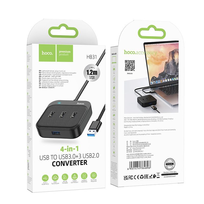 Адаптер Hoco HB31 USB-Xaб на 4 USB (USB3.0+USB2.0*3) 1,2m цвет: черный