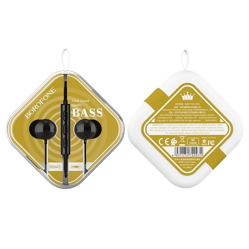 Проводные наушники с микрофоном Borofone BM45 черного цвета-это гарнитура предназначена для прослушивания музыки через разъём 3,5 мм. Эргономичный дизайн, идеальный размер вкладыша, микрофон, проводное управление с помощью многофункциональной кнопки и кнопок регулировки громкости, прямая форма штекера. Характеристики: Динамик: 10мм, Аудио разъем: Ø3.5мм, Длина провода: 1.2 м. Общий вес: 45 г, Материал изготовления: ABS + TPE эмалированный провод, Микрофон: пульт с микрофоном.