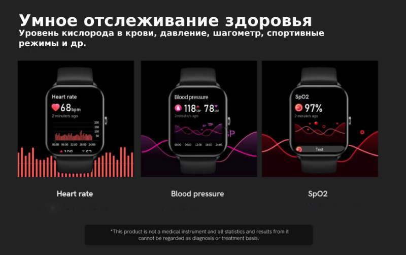 70 видов профессиональных режимов упражнений, определение частоты сердечных сокращений, продолжительности сна, калорий и других данных в режиме реального времени.