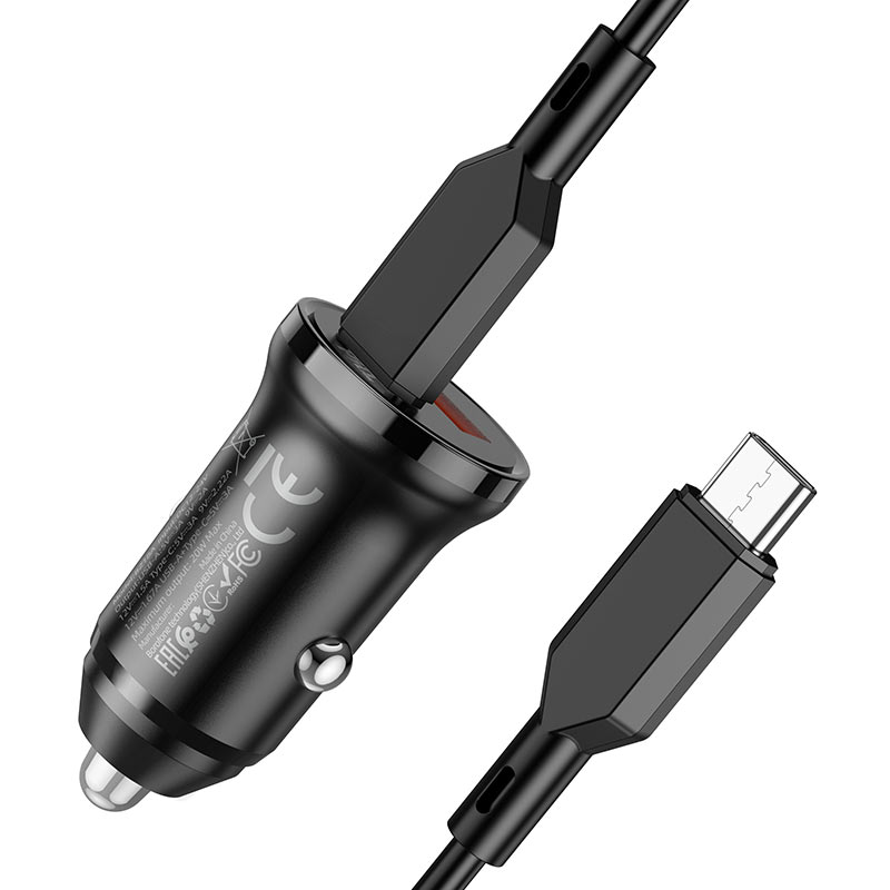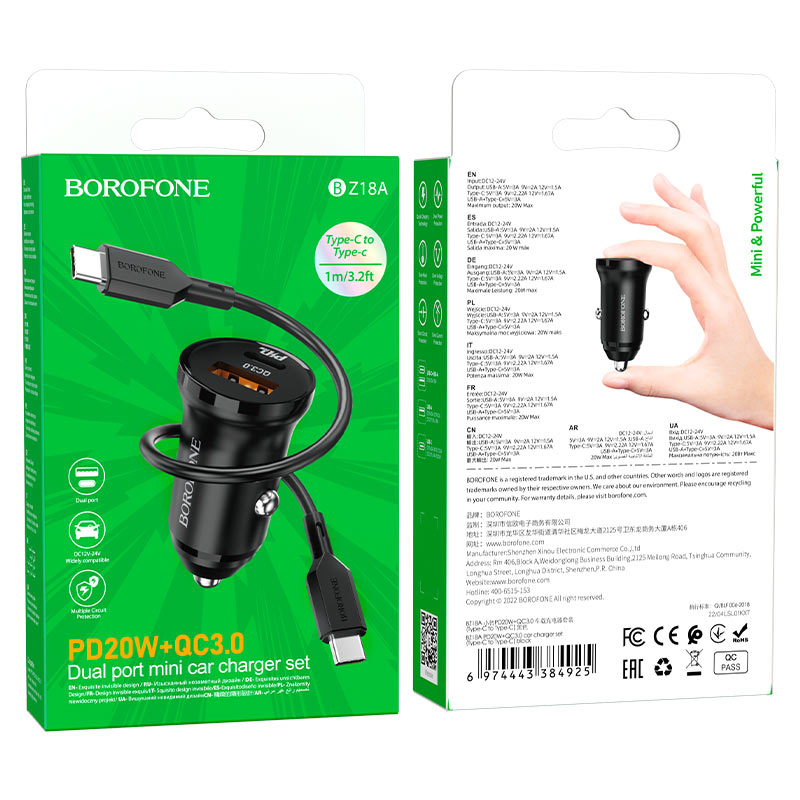 BOROFONE BZ18A, автомобильное зарядное устройство с двумя портами USB 18W и USB-C 20W, поддержка протоколов быстрой зарядки, набор с кабелем USB-C на USB-C