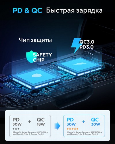 Продукт представляет собой автомобильное зарядное устройство мощностью 60 Вт. Он имеет двойные выходные порты PD и QC3.0 и обеспечивает быструю зарядку для 2 устройств одновременно.