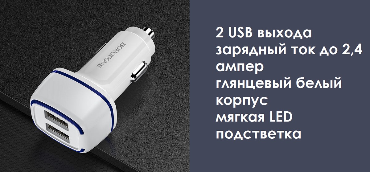 Зарядное устройство для портативной электроники для использования в автомобиле. Зарядка имеет два USB зарядных порта, соответственно заряжать можно два устройства одновременно. Корпус изготовлен из глянцевого огнеупорного ABS пластика. В корпус встроена мягкая LED подсветка.