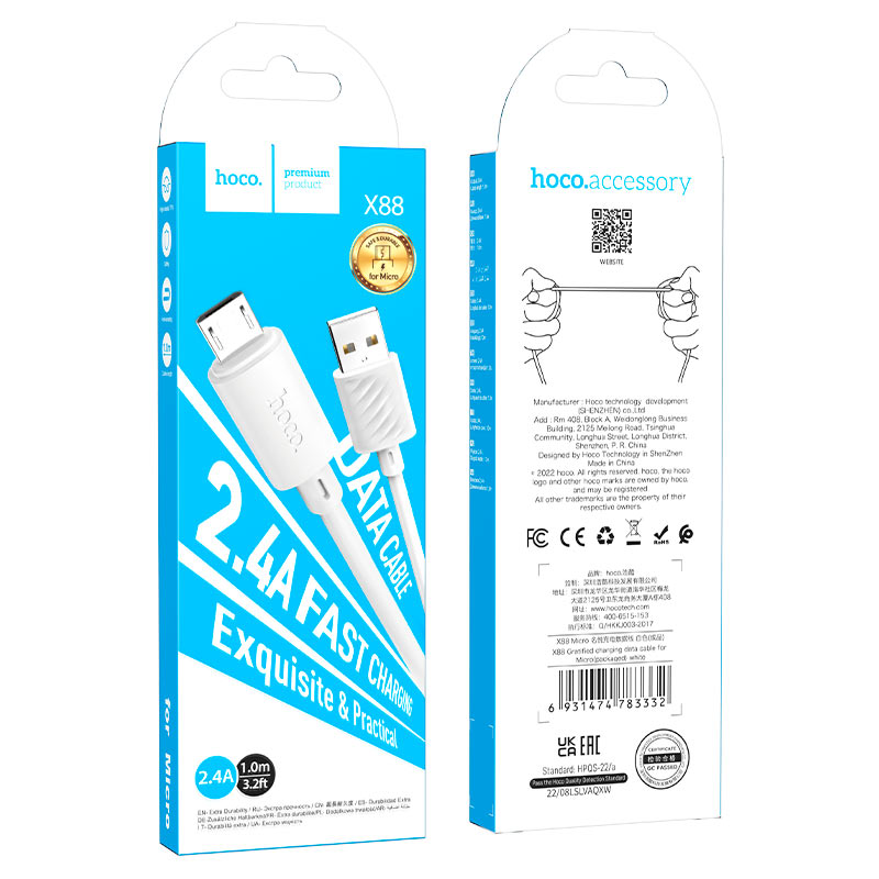 X88 Gratified, кабель для зарядки и передачи данных USB на Micro-USB, ток до 2.4A, PVC оплётка, длина – 1м