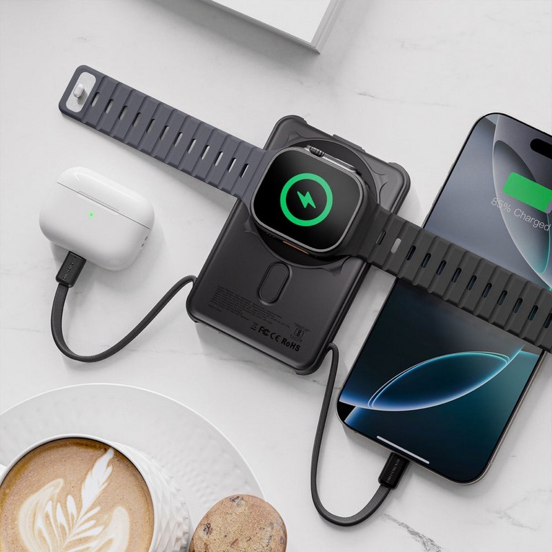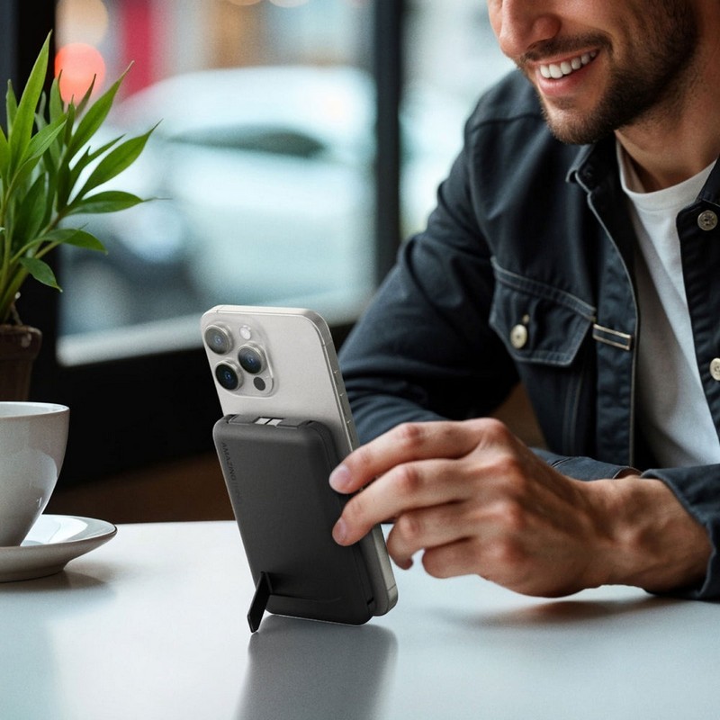 Повербанк на 10 000 мАч — заряжайтесь в дороге кабелем или без проводов. Поддерживает беспроводную зарядку до 15 Вт и быструю зарядку через Type-C (20 Вт). Магнитное крепление MagSafe позволяет удобно заряжать iPhone.