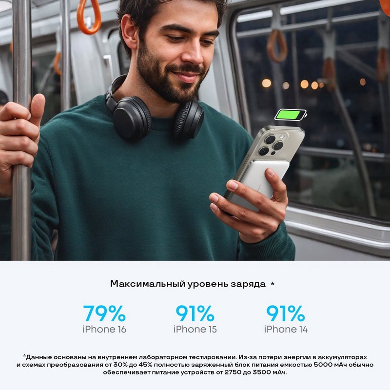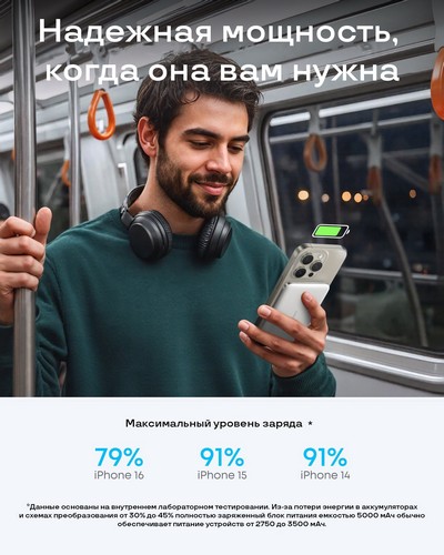 - Емкость аккумулятора 5000 мАч обеспечивает до 91% заряда iPhone 15.