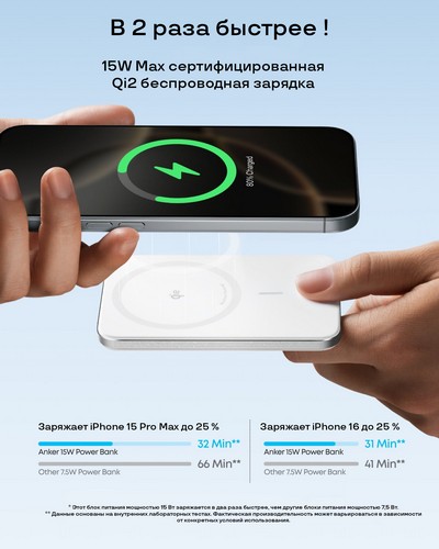 Беспроводное зарядное устройство Power Bank Anker Nano Air2 — это элегантное и стильное беспроводное зарядное устройство, которое идеально подходит для всех, кто хочет быстро и удобно заряжать свой телефон. Повербанк оснащен быстрой беспроводной зарядкой мощностью 15 Вт для iPhone с MagSafe. Зарядное устройство также совместимо с множеством других устройств, поддерживающих беспроводную зарядку Qi2.