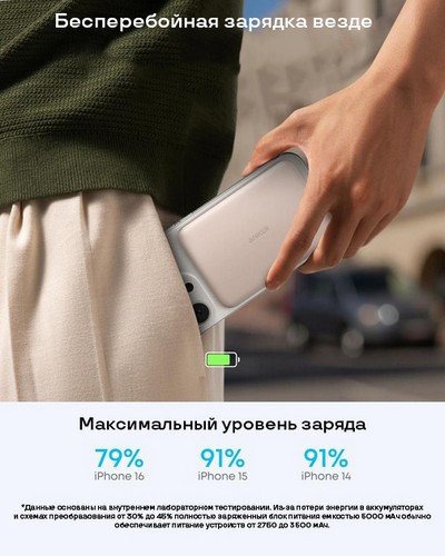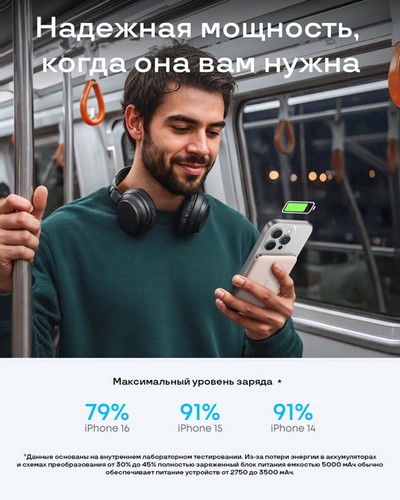 - Емкость аккумулятора 5000 мАч обеспечивает до 91% заряда iPhone 15.