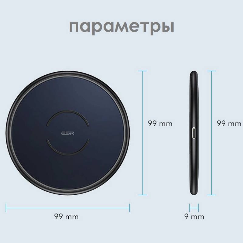 Устройство имеет контурный световой индикатор. Изготовлено из пластика с алюминиевой окантовкой. Для более точного позиционирования смартфона зарядка оснащена магнитным кольцом.