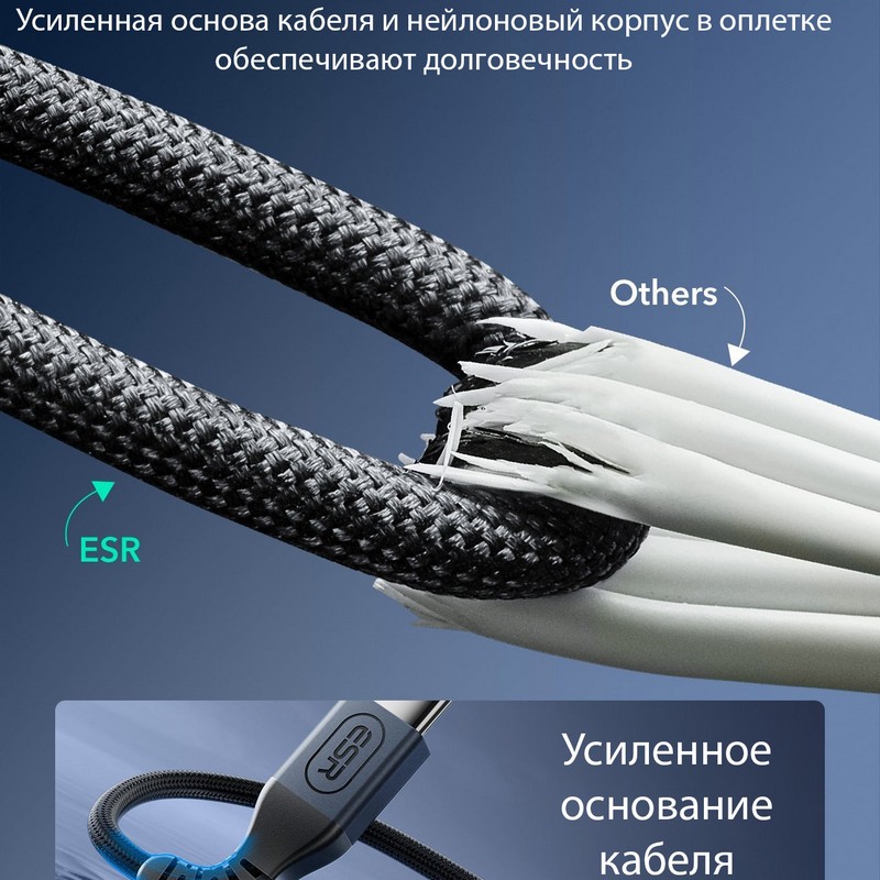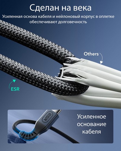 Долговечность: усиленное основание кабеля и прочный нейлоновый корпус в оплетке обеспечивают высокую прочность.