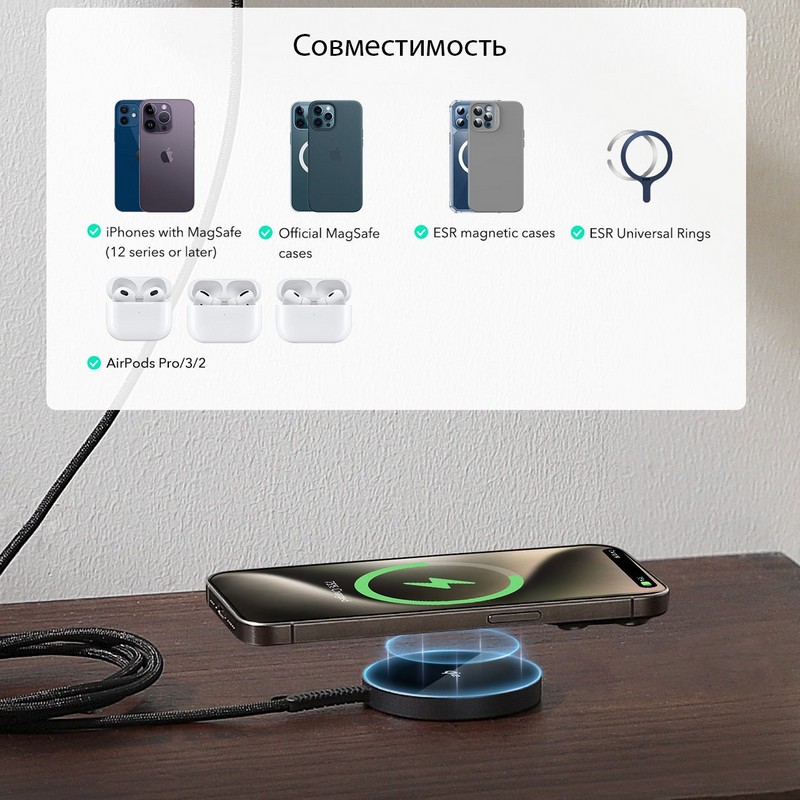 Совместимость: для iPhone 13 серии и более поздних моделей, официальных чехлов MagSafe, магнитных чехлов ESR и универсальных колец ESR.