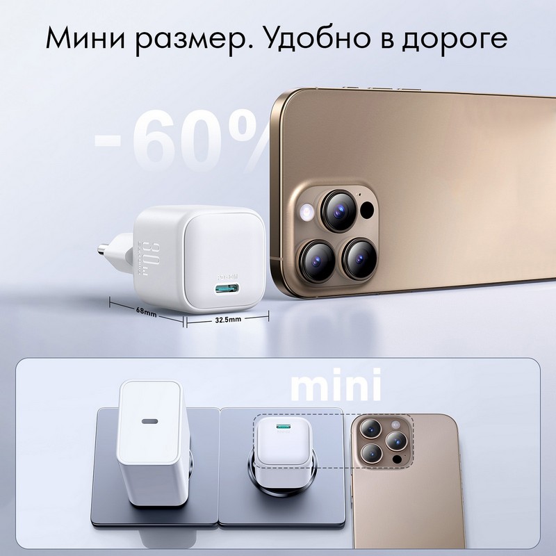 - Миниатюрный и портативный, на 60% меньше оригинального зарядного устройства на 30 Вт