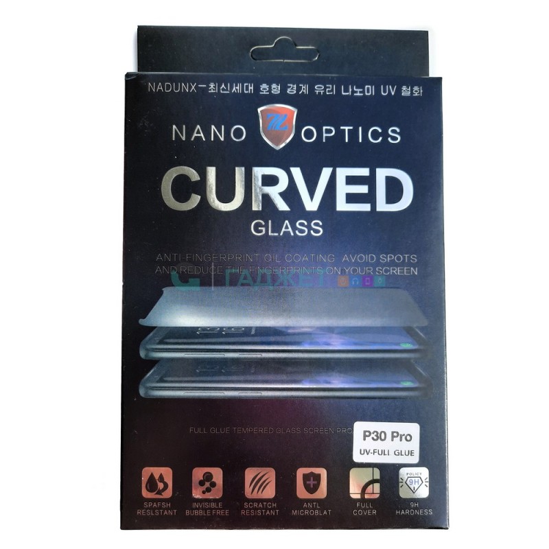 Жидкий клей равномерно распределяется по всему изогнутому экрану Huawei P30 Pro, заполняя в том числе пространства царапин и потертостей, после чего застывает, создавая непроницаемый защитный барьер. Такие стекла защищают весь экран , в то время как другие не закрывают закругленные края модели. Стекло не имеет черных рамок, которые в предыдущих моделях перекрывали часть экрана. Стекло прочное, имеет твердость 9H и толщину 0.2 мм. В комплекте идет специальная УФ лампа.